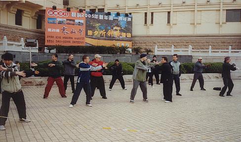 Am ersten Tag stellten die Lehrer den Gruppen ihr jeweiliges Programm vor: Qian Zhao Hong – Xing Yi der 10 Tiere Wei Chen Yuan und sein Schüler Chan Zhuen Yuan (63 Jahre) - Xing Yi der 12 Tiere Dr. Wang Zhi Xiang mit seinem Übersetzer Paul – Yang Stil Taiji Xu Guo Chuang – Wu Stil Taiji Jiang Zhong Bao – Chen Stil Taiji Wu Ji – Lan Shou An den folgenden Tagen konnte jeder Teilnehmer zu dem Meister gehen, der ihn am meisten zusagte. Jeden halben Tag durfte man wechseln, so daß man alle Lehrer gut kennenlernen konnte. Bald bildeten sich jedoch ziemlich stabile Gruppen heraus, nur wenige wechselten des öfteren den Lehrer. George schaute übrigens jeden Morgen und jeden Nachmittag vorbei. Qian Zhao Hong (Kettensäge) und Dr. Wang Zhi Xiang hatten immer die größte Gefolgschaft. Ob große oder kleine Gruppe, alle waren des Lobes voll von ihrem Meister. Diese zeigten sich offen und mitteilsam, ließen sich anfassen und brachten ihren Schülern etwas bei, was einige bei der Schlußfeier mit ihrer Gruppe demonstrierten.